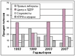 На рис.1 показаны итоги голосования на выборах в Госдуму в Санкт-Петербурге, и хорошо заметно, что симпатии наших соседей за последние 15 лет склонились в пользу "центристов".